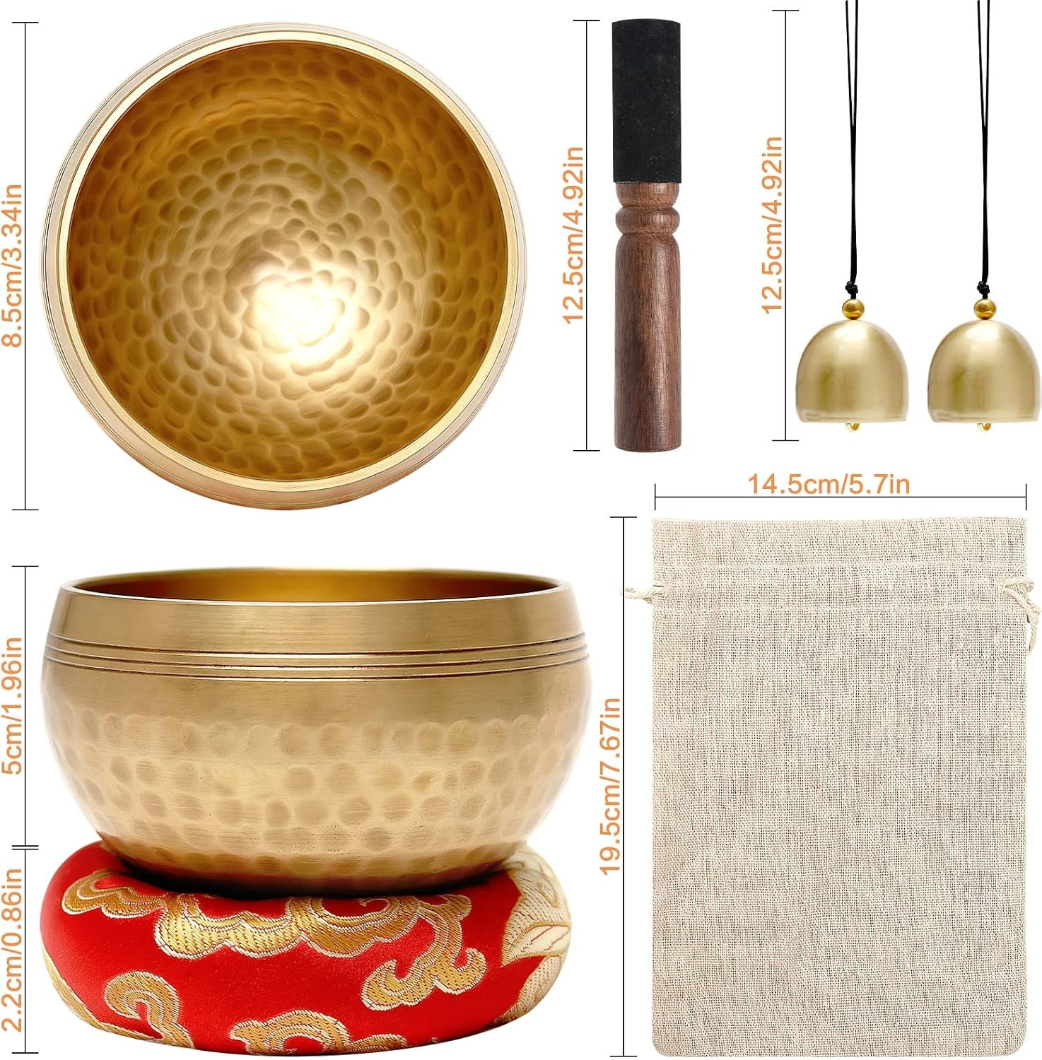 - Juego de cuencos tibetanos: nuestro juego de cuenco tibetano está hecho a mano por artesanos con materiales de latón de alta calidad. Los cuenco tibetano pequeño miden 8,6 cm de diámetro y el juego incluye también dos campana, palitos de madera, cojines y una bolsa para guardarlos. Las campanas budistas tibetanas le ayudarán a aliviar la tensión, el estrés y la ansiedad y a encontrar la paz interior: ¡un objeto indispensable para la vida cotidiana!