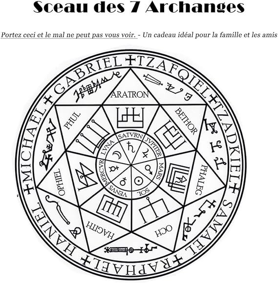 - Medalla Talismán de los 7 Arcángeles. Amuleto Mágico de Protección de Salomón. El borde exterior del colgante «Los Sellos de los Siete Arcángeles» (Sello de la Jerarquía Planetaria) contiene los nombres de los siete ángeles regentes planetarios. En las esquinas exteriores, se encuentran los nombres de los siete espíritus y sus sellos, mientras que los círculos interiores evocan los nombres de los planetas latinos y sus glifos.