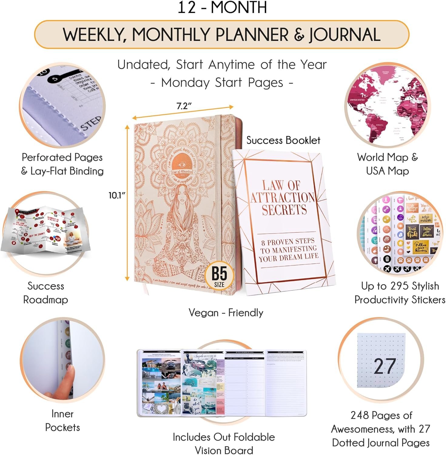 Planificador de la ley de atracción: planificador semanal de lujo sin fecha, mensual, un viaje de 12 meses para aumentar la productividad y la felicidad: organizador de vida
