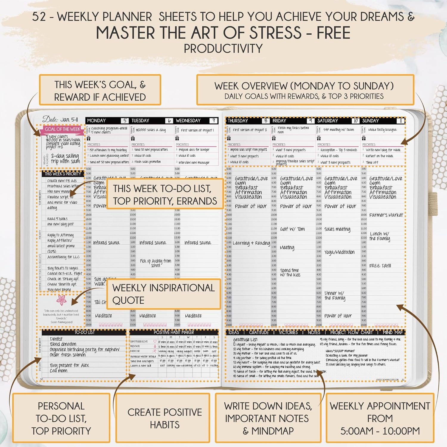 - PLANIFICADOR SIN FECHA: todas las herramientas de éxito que necesitas para crear la vida que siempre quisiste. Páginas de inicio en domingo, tamaño B5 (7,2 x 10,1 pulgadas), papel grueso de 100 g/m², 248 páginas de transformación de vida, 52 resúmenes de planificación semanal y 12 mensuales y reflexiones, 30 páginas de diario punteadas, hasta 295 pegatinas de productividad, rastreadores de hábitos, mapas mentales, tablero de visión plegable, rutinas matutinas y vespertinas. Este planificador de vida es un planificador diario SIN FECHA, un planificador semanal sin fecha y un planificador mensual sin fecha, lo que te da la libertad de comenzar tu viaje cuando más te convenga.