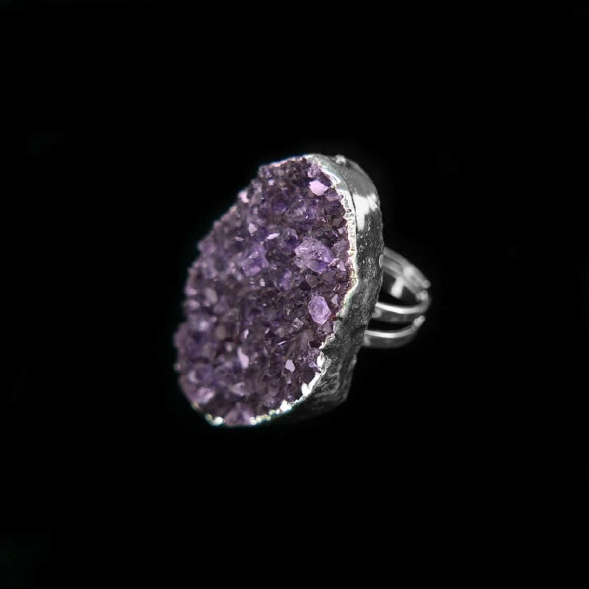 - Anillo con Amatista: en las filas de cristales con propiedades energéticas, no existe ninguna tan famosa como la Amatista. Una de las pocas piedras con una coloración púrpura única, forma de cuarzo que contiene hierro y otros minerales en su estructura. Al igual que la Fluorita, las propiedades de la piedra Amatista destacan por ser una piedra meditativa y relajante que funciona en los planos emocional, espiritual y físico con la que alcanzarás la calma y la paz.