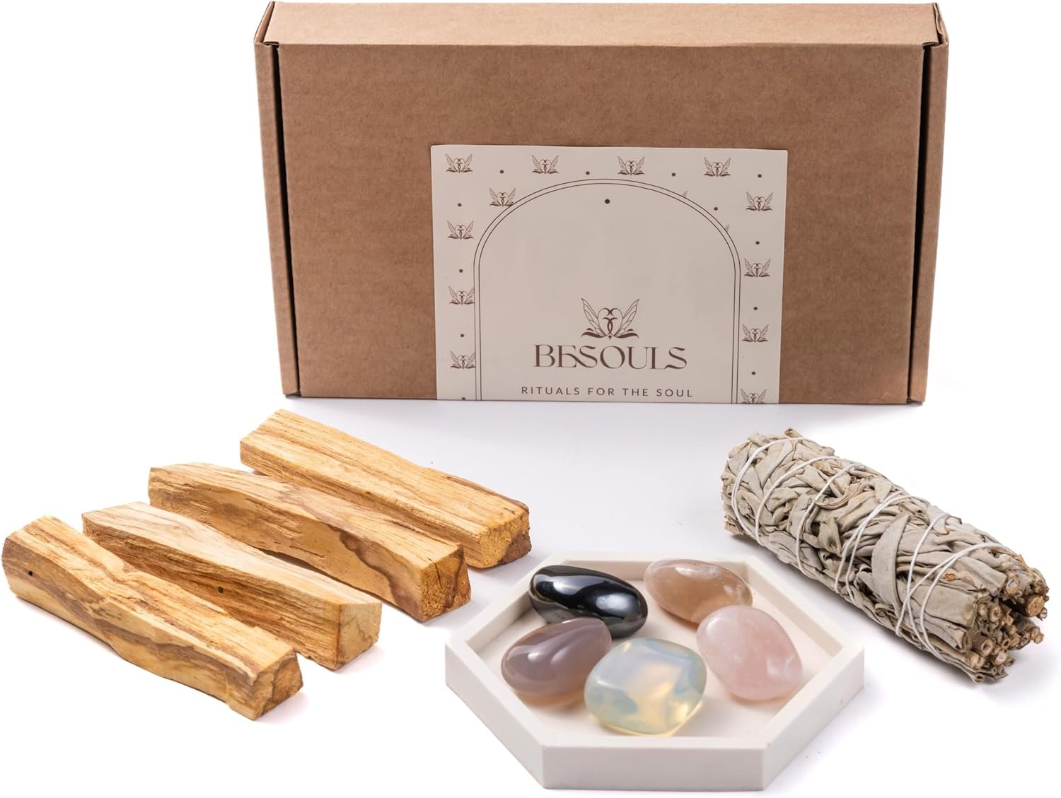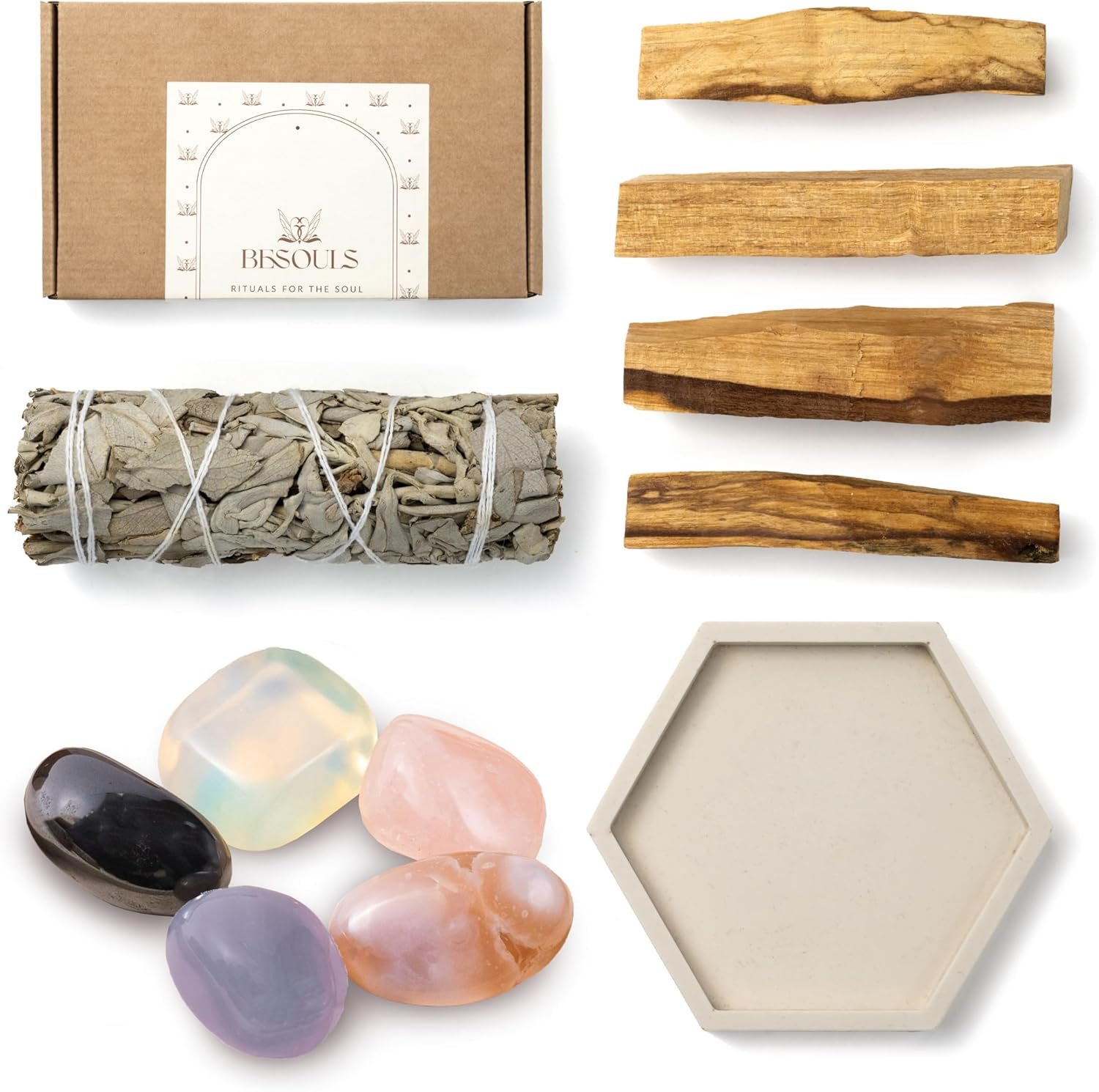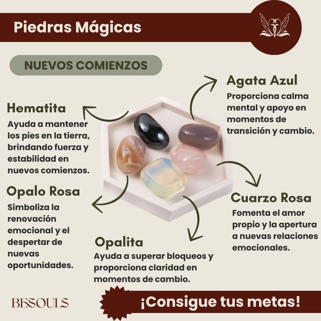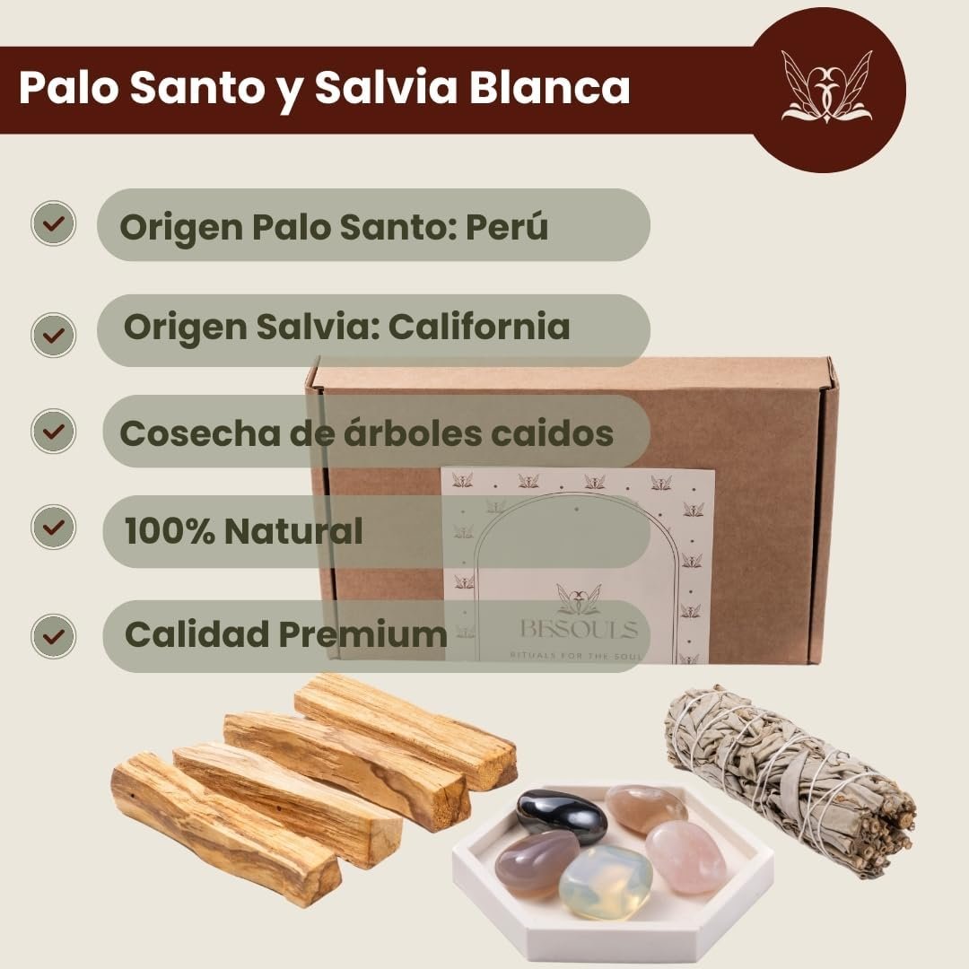 - Kit Premium «Nuevos comienzos». Incluye 4 Palo Santo para quemar, 1 Salvia Blanca para quemar y 5 piedras mágicas: Cuarzo Rosa, Hematita, Ágata floreada, Opalita y Ágata azul . Transforma tu espacio con este ritual y su sahumerio limpieza energética.