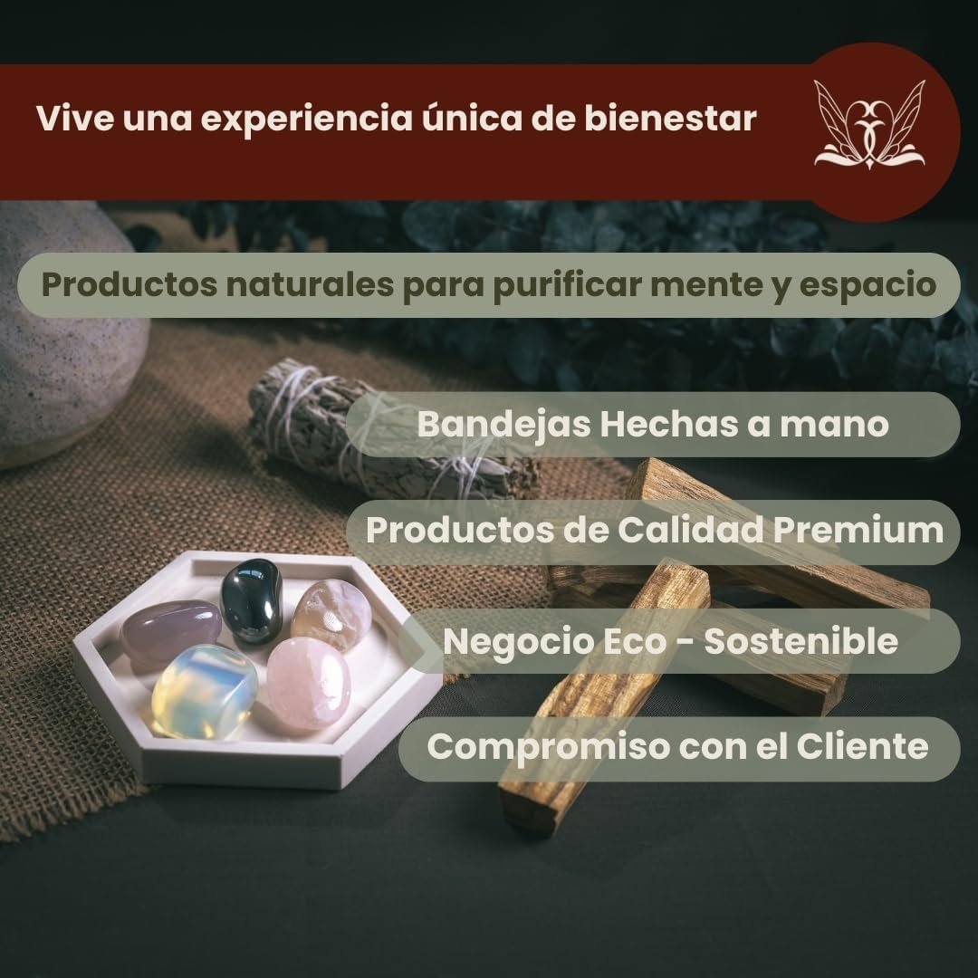 - Bandeja hecha a mano única. Cada kit incluye una bandeja artesanal única, creada a mano con materiales de alta calidad. Ideal para usarlo como altar espiritual con tus piedras mágicas y decorar tu espacio con un toque espiritual exclusivo. exclusivo.