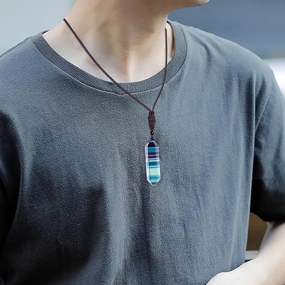 • Colgante con fluorita: La fluorita es una piedra conocida por su capacidad para aportar claridad mental y equilibrio emocional. Se asocia con la concentración, el enfoque y la toma de decisiones, ayudando a organizar los pensamientos y reducir la confusión. También se considera una piedra de protección energética, ideal para absorber energías negativas y promover la armonía interior. Por su energía calmante, la fluorita favorece la estabilidad, la creatividad y el aprendizaje, siendo muy apreciada tanto a nivel espiritual como decorativo.