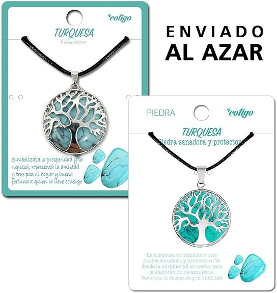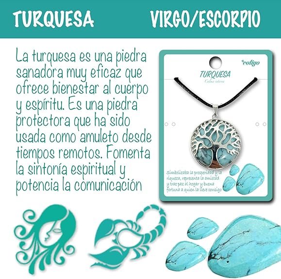 • El collar Árbol de la vida con turquesa es perfecto si eres Virgo o Escorpio: el signo zodiacal influye también en la elección de una piedra natural y además puede dar suerte como talismán personal. Cada signo del zodiaco tiene asignadas diversas piedras que sirven para intensificar o debilitar las cualidades propias de cada uno, por eso lleva la piedra que pertenece a tu signo te ayudará a potenciar todo lo que eres.