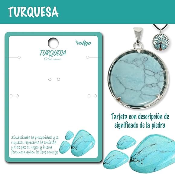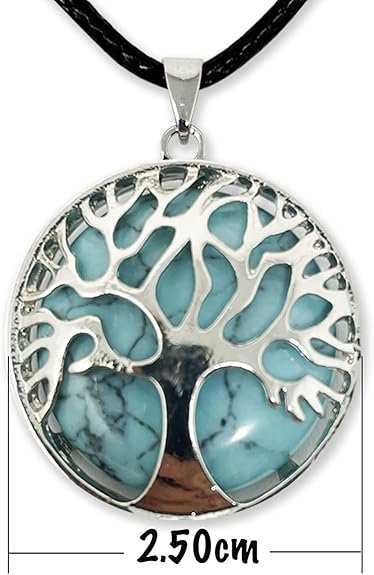 • Collar Árbol de la vida con turquesa:  un cordón encerado negro 45cm para colgante. El diámetro del colgante es 2.5cm. Como se trata de un colgante de piedra natural estas medidas pueden variar un poco.