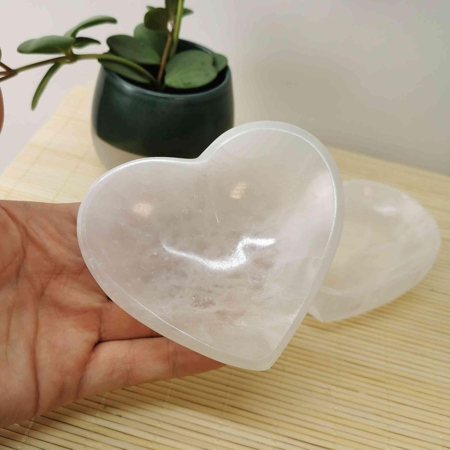 - Cuenco de selenita natural en forma de corazón: la selenita es mucho más que una piedra. Apreciada desde hace siglos por sus propiedades purificadoras, protectoras y equilibrantes – tanto en tradiciones espirituales como en espacios modernos-, constituye un símbolo de claridad, luz y paz interior.