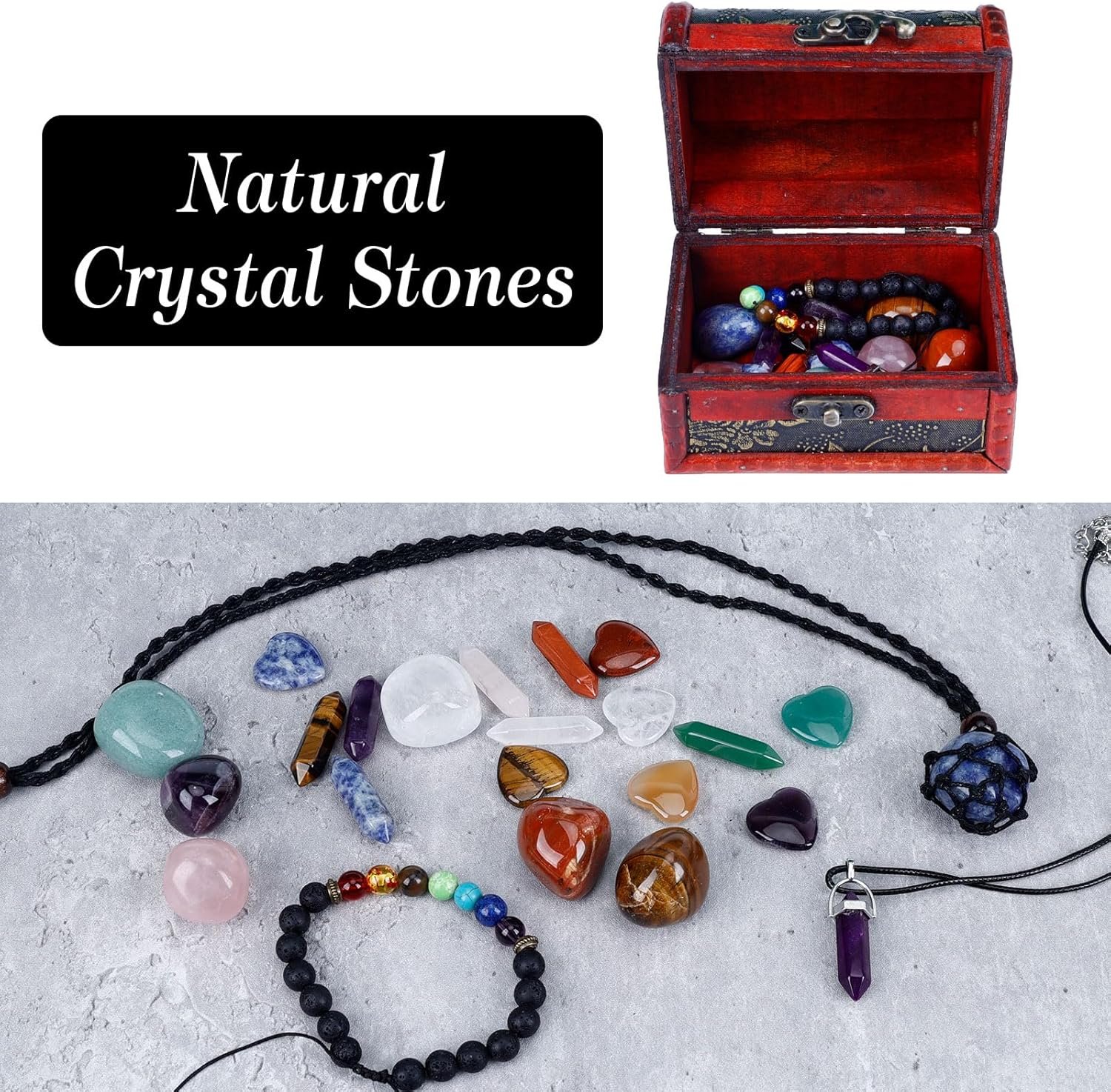 Juego de cristales curativos naturales con caja del tesoro vintage