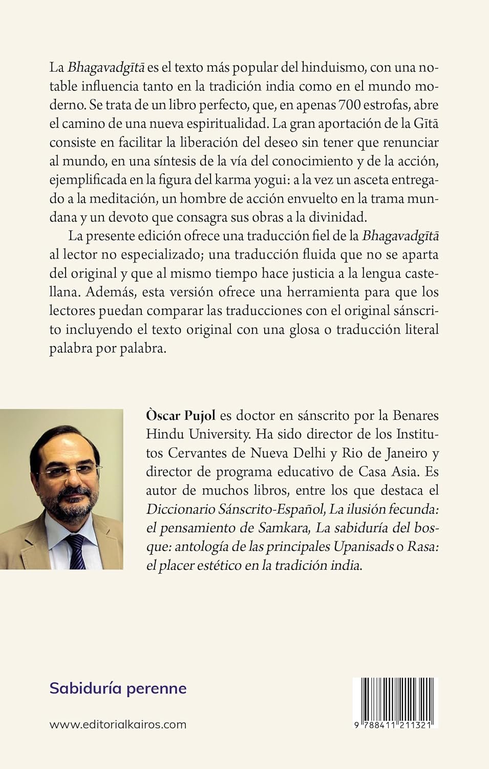 La Bhagavadgītā es el texto más popular del hinduismo, con una notable influencia tanto en la tradición india como en el mundo moderno. Se trata de un libro perfecto, que, en apenas 700 estrofas, abre el camino de una nueva espiritualidad. La gran aportación de la Gītā consiste en facilitar la liberación del deseo sin tener que renunciar al mundo, en una síntesis de la vía del conocimiento y de la acción, ejemplificada en la figura del karma yogui: a la vez un asceta entregado a la meditación, un hombre de acción envuelto en la trama mundana y un devoto que consagra sus obras a la divinidad. La presente edición ofrece una traducción fiel de la Bhagavadgītā al lector no especializado; una traducción fluida que no se aparta del original y que al mismo tiempo hace justicia a la lengua castellana. Además, esta versión ofrece una herramienta para que los lectores puedan comparar las traducciones con el original sánscrito incluyendo el texto original con una glosa o traducción literal palabra por palabra.