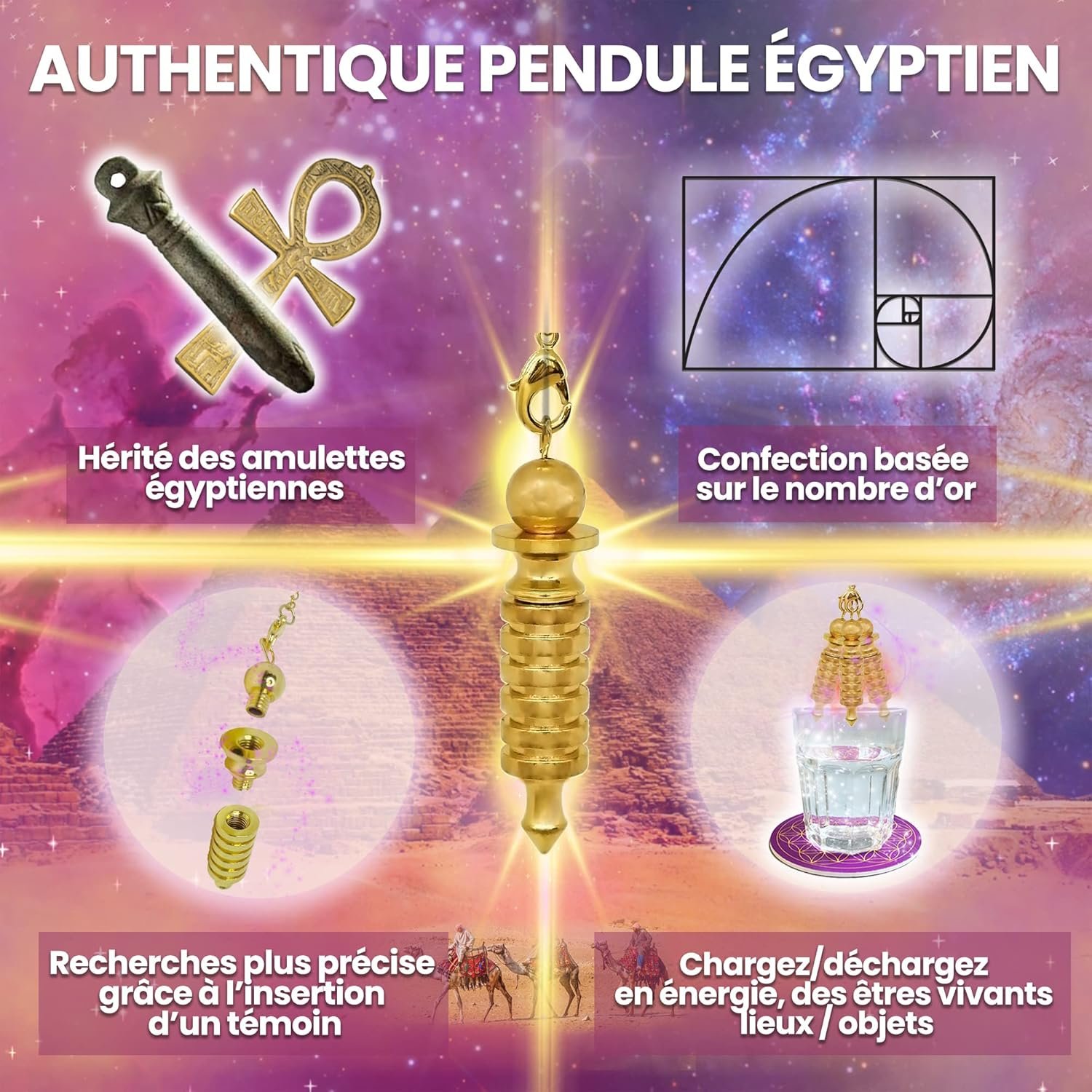 Péndulo egipcio de radiestesia Isis de latón dorado| Péndulo de adivinación con testigo magnetizador