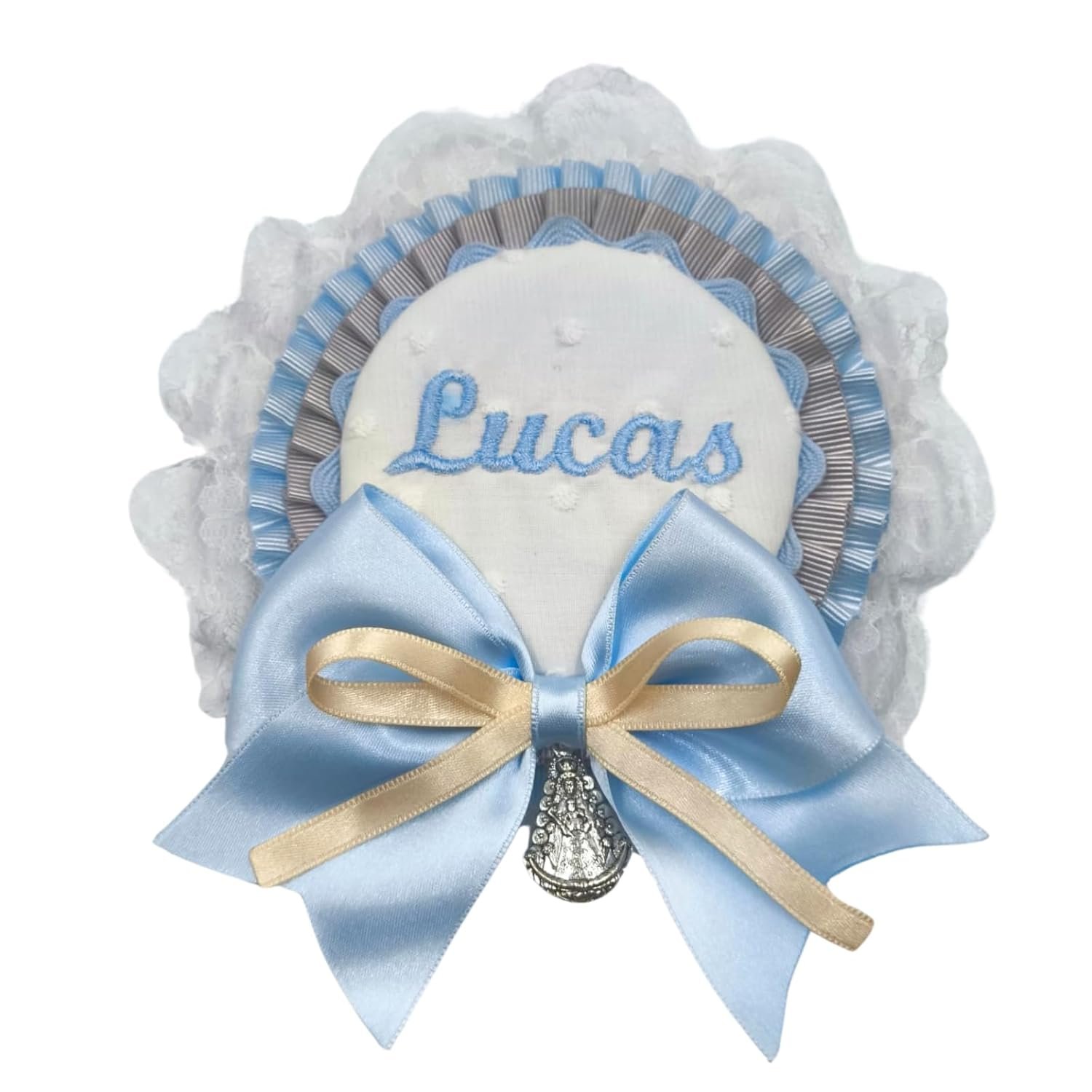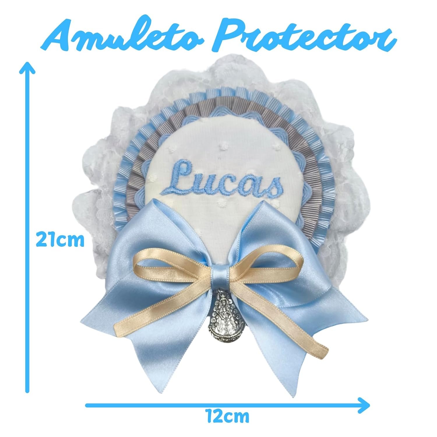 Amuleto protector celeste cosido a mano. Broche con nombre personalizado para bebés, con medalla de la Virgen del Rocío