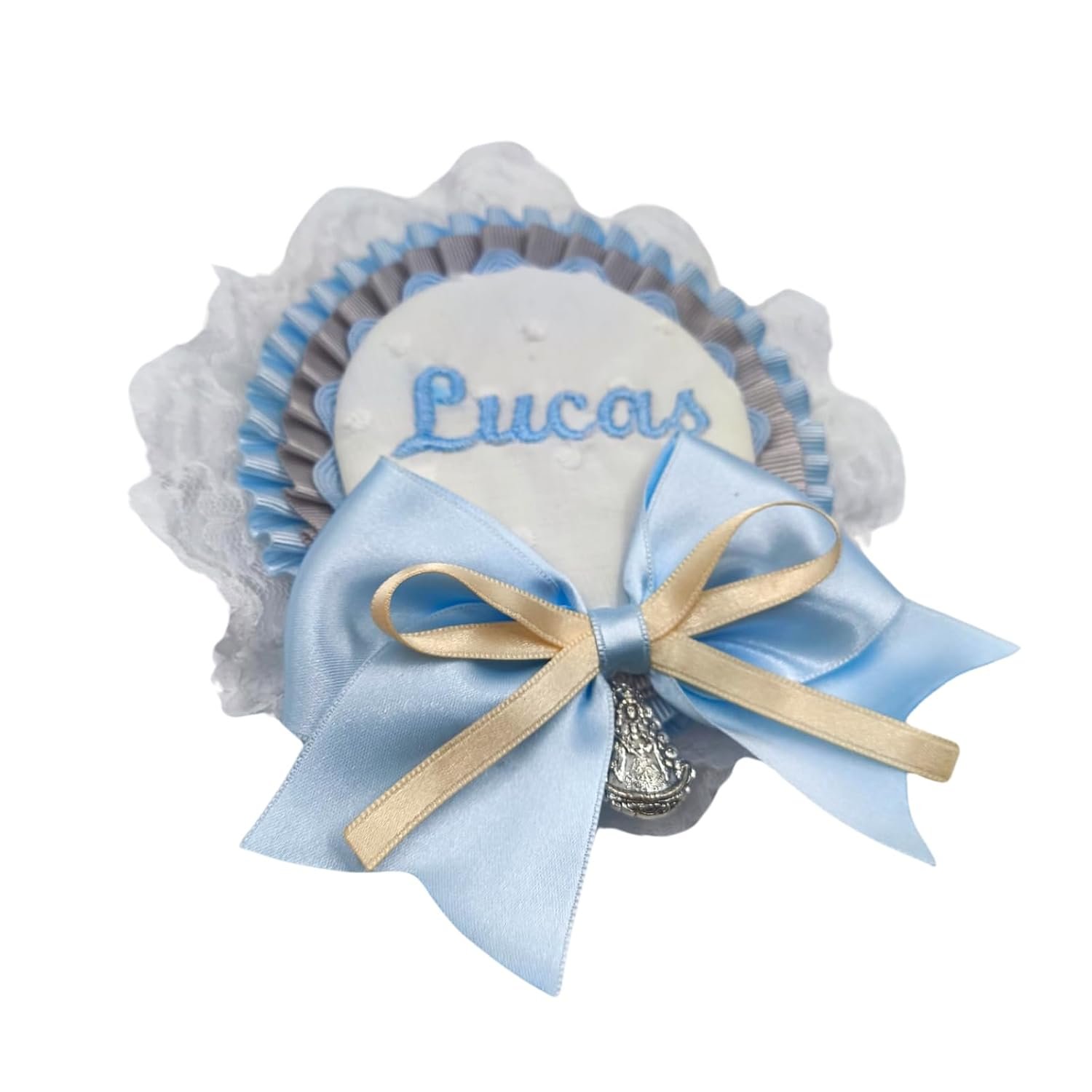 Este broche personalizado para carro de bebé es el accesorio perfecto para quienes buscan un amuleto protector y un toque de estilo único. Con una medalla de la Mano de Fátima, este broche ofrece protección espiritual frente al mal de ojo y malas energías, asegurando que tu bebé esté siempre protegido en sus paseos. Además, puedes personalizar con el nombre de tu bebé y los lazos en tonos suaves como blanco, beige y celeste, creando un detalle único que embellece el carrito de bebé.