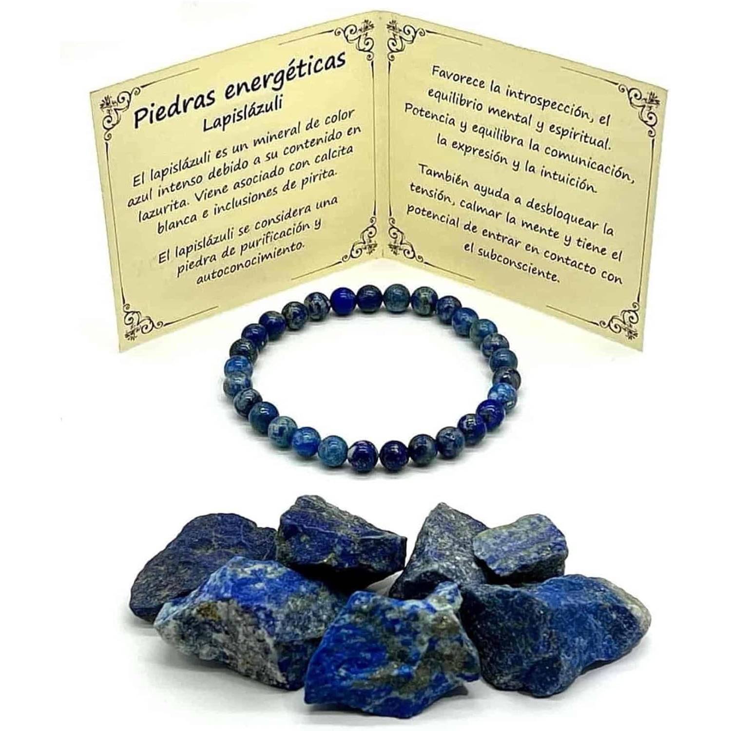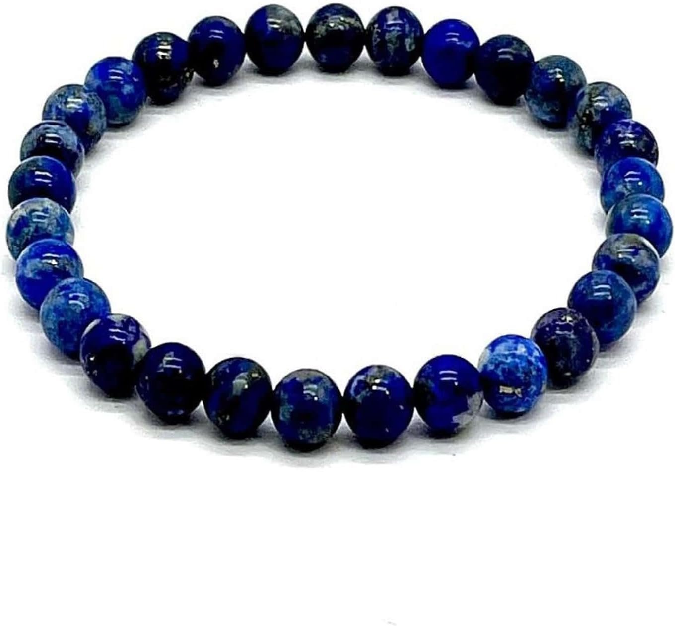 - Pulsera de lapislázuli: pulsera elástica y ajustable con bolas de lapislázuli de 6 mm de diámetro. Está hecha a mano con 28-30 cuentas de lapislázuli que forman una circunferencia interior de 18 cm ajustables.