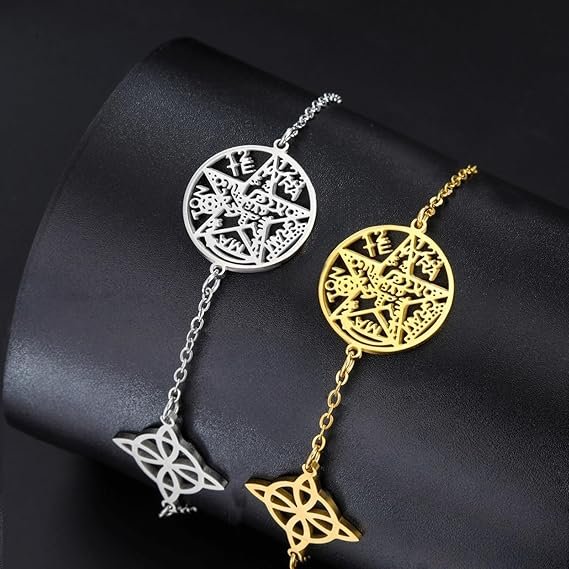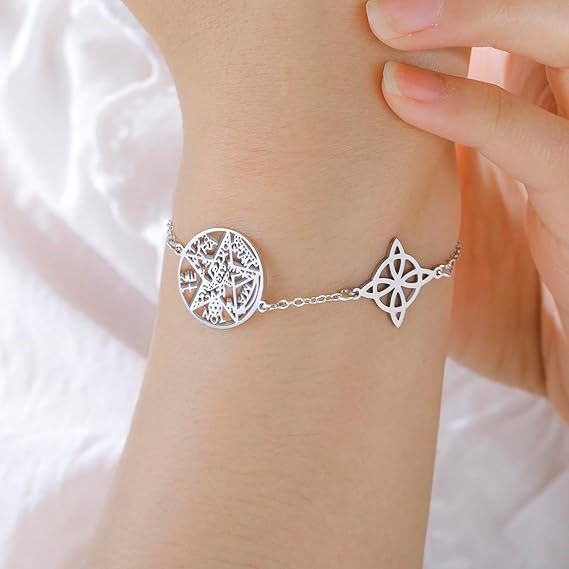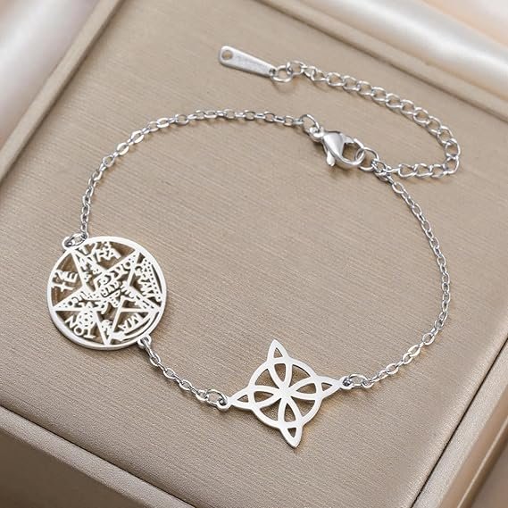- Pulsera nudo de bruja y Tetragrammaton: esta pulsera combina maravillosamente símbolo de protección y buena suerte y proporciona protección contra las energías negativas gracias al nudo de bruja; El Tetragrammaton, representa el nombre sagrado de Dios y significa protección y equilibrio divinos. Esta pulsera, por lo tanto, constituye un amuleto de doble protección que te traerá suerte y una potente protección. Perfecto para aquellos interesados en la wicca pagana o espiritualidad.