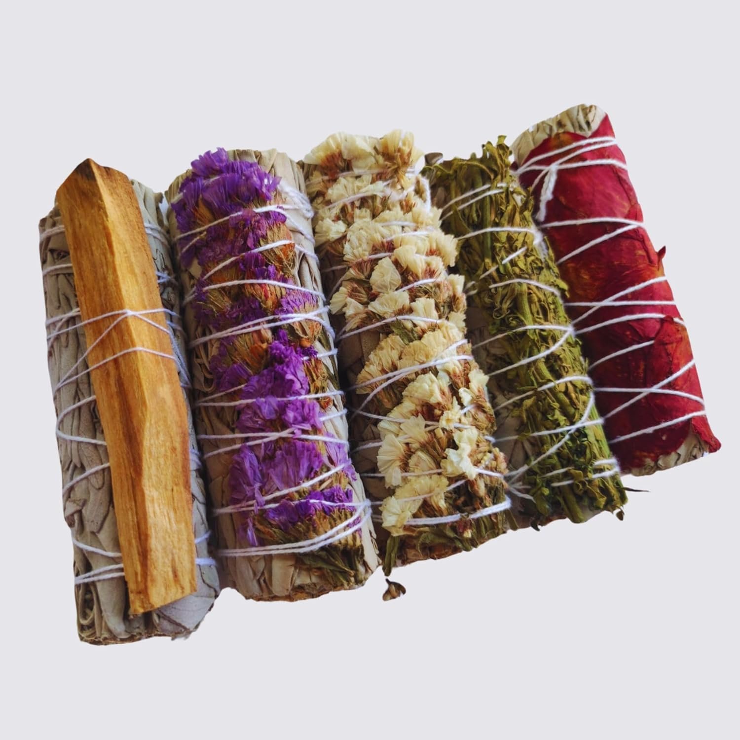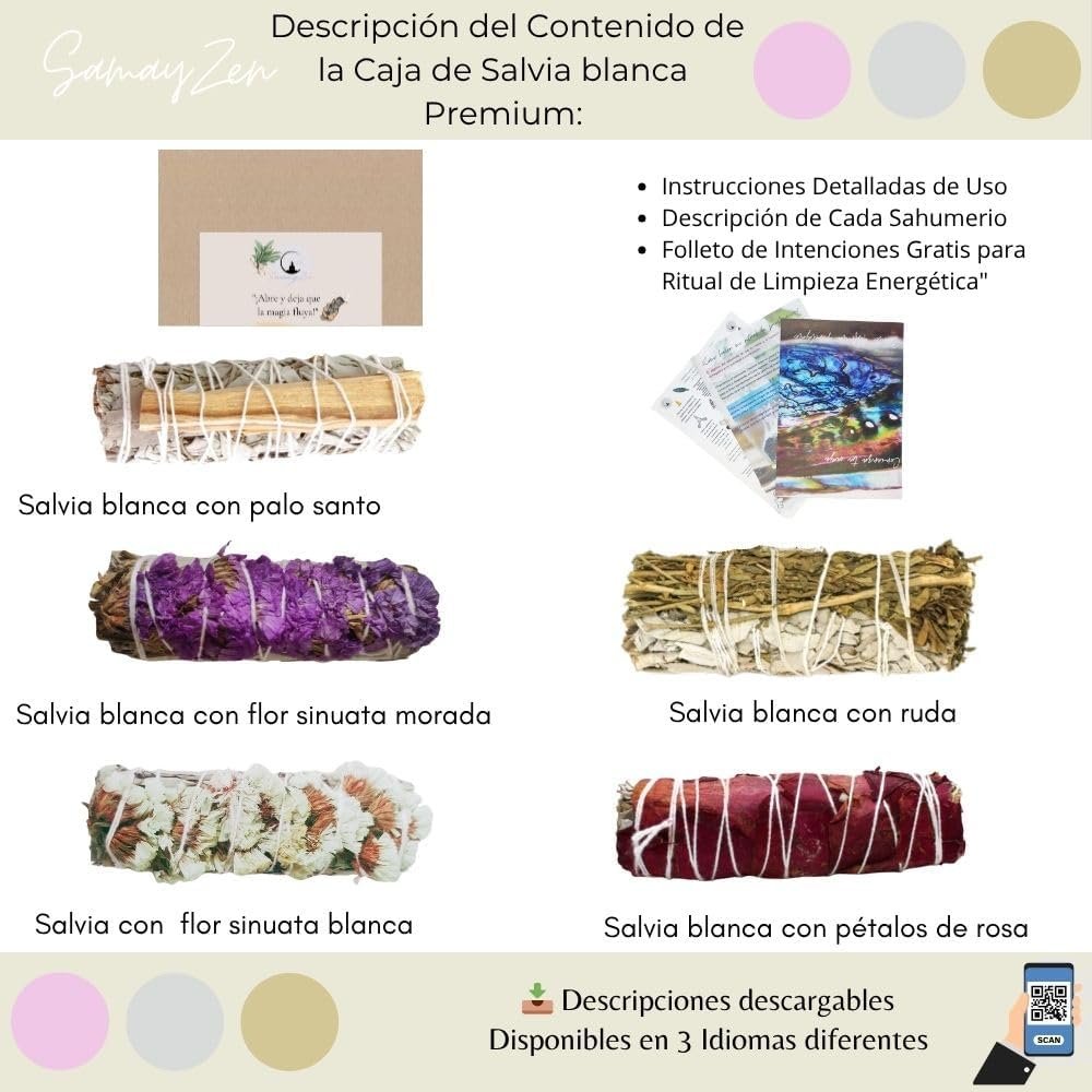 Kit Sahumerios de Salvia blanca para quemar con Sinuata blanca, Ruda morada, Salvia con pétalos de Rosa y Salvia con Palo Santo – Incienso natural para meditación y limpieza energética