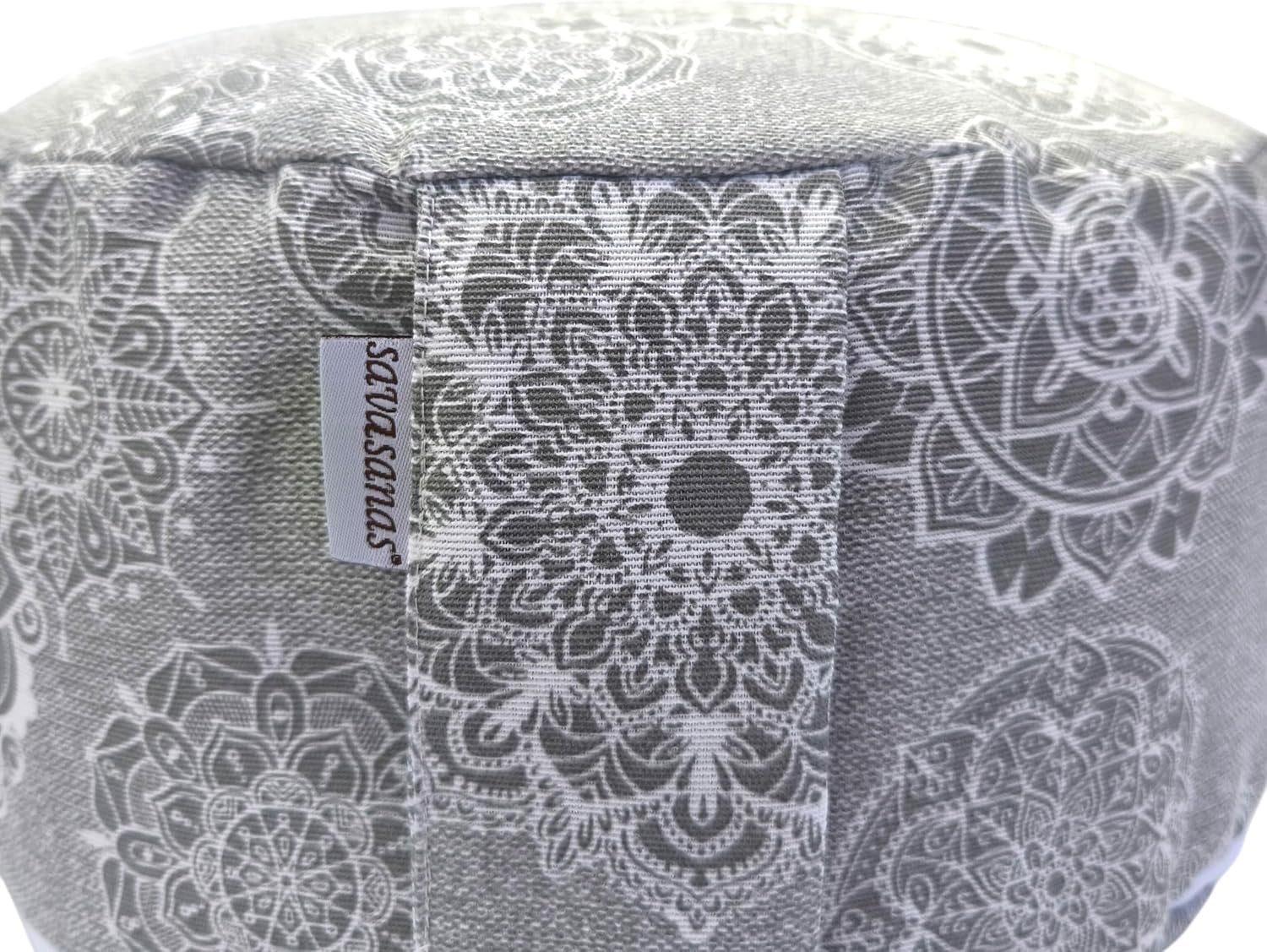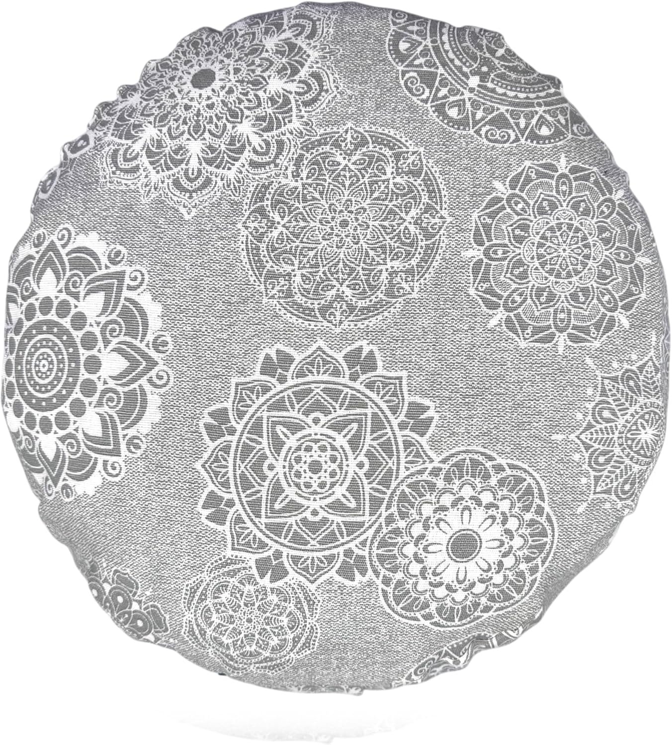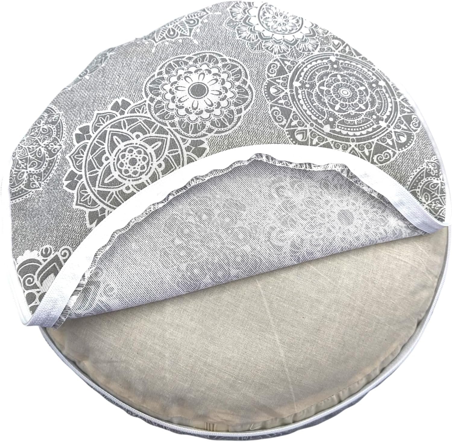 Zafu meditación con mandalas gris. Cojin para yoga. Zafu yoga con funda e interior y exterior lavable de algodón y relleno de cáscara de trigo sarraceno con asa de transporte 32x16cm