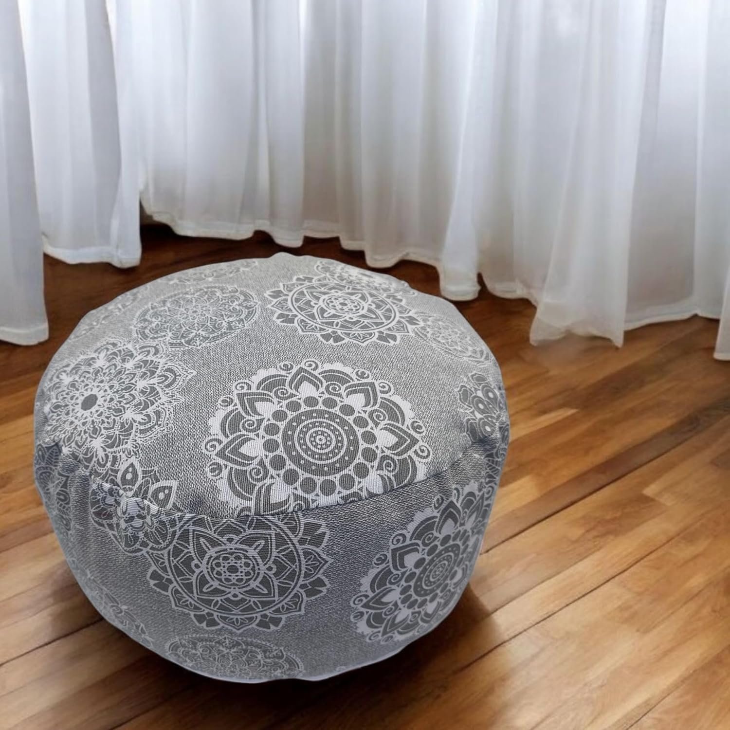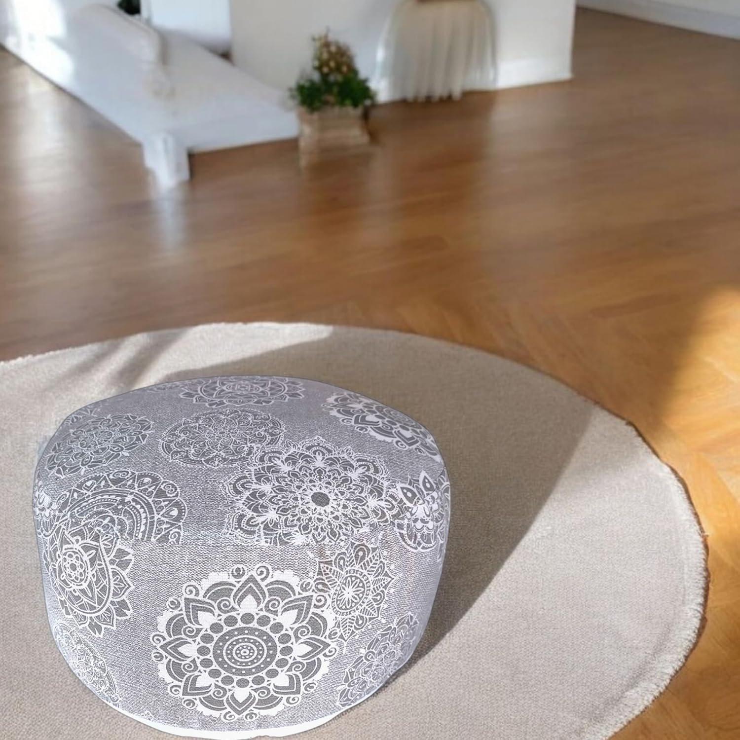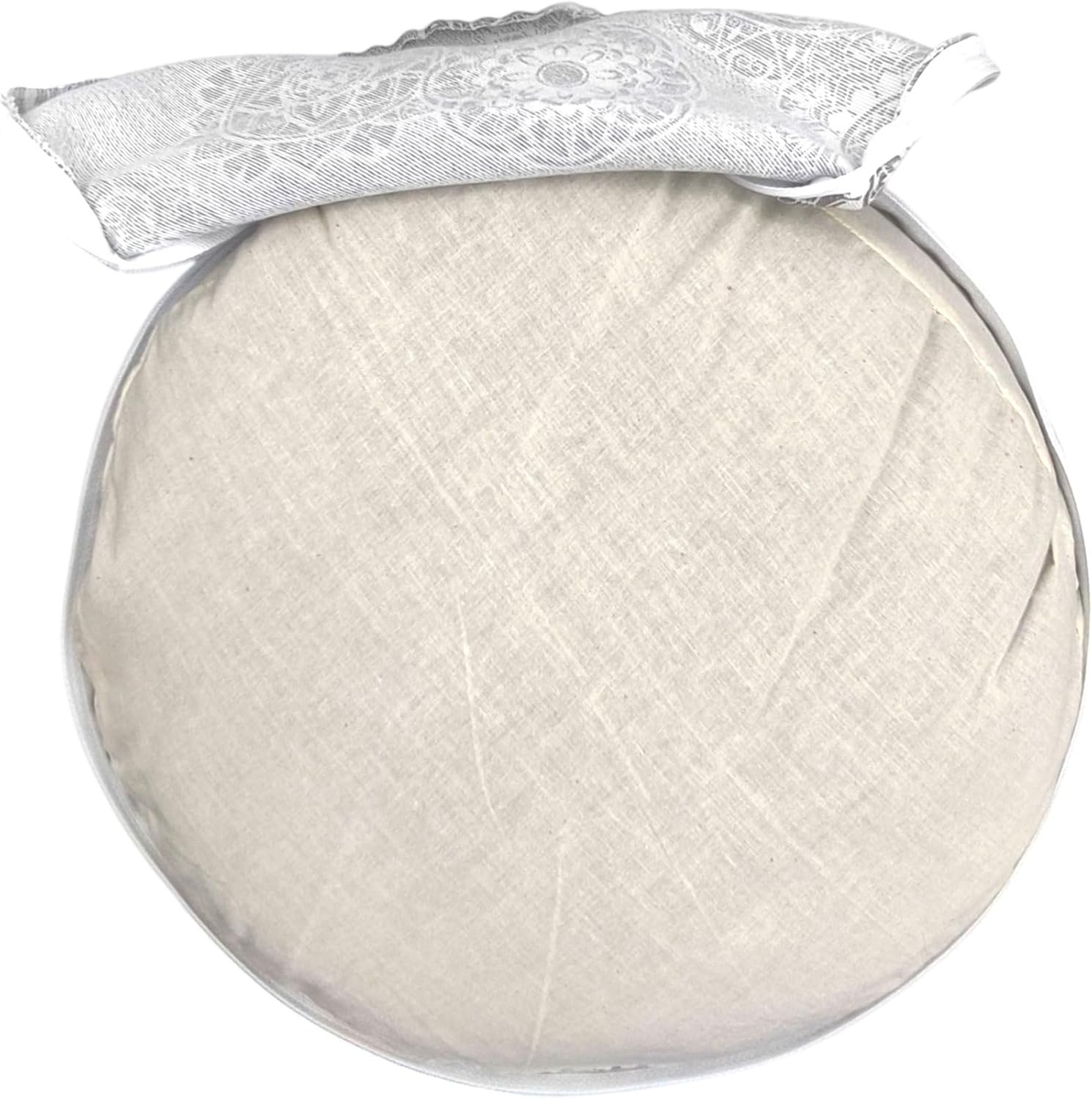 Zafu meditación con mandalas gris. Cojin para yoga. Zafu yoga con funda e interior y exterior lavable de algodón y relleno de cáscara de trigo sarraceno con asa de transporte 32x16cm