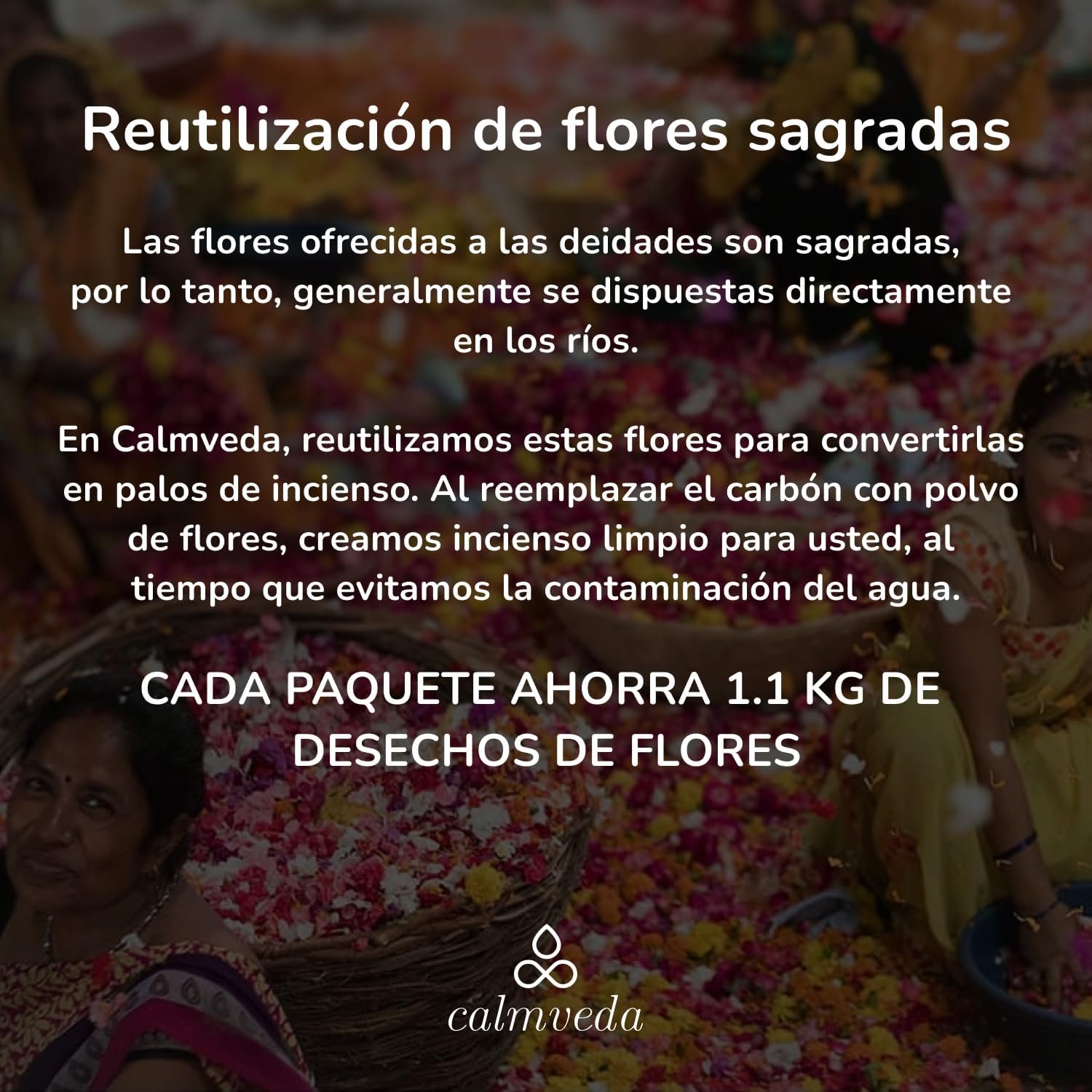 - HECHO DE FLORES SAGRADAS: cada año se ofrecen más de 800 mil toneladas de flores a los dioses en la India, que luego se eliminan directamente en los ríos. RECICLAMOS estas flores sagradas para usarlas en nuestras varitas de incienso.