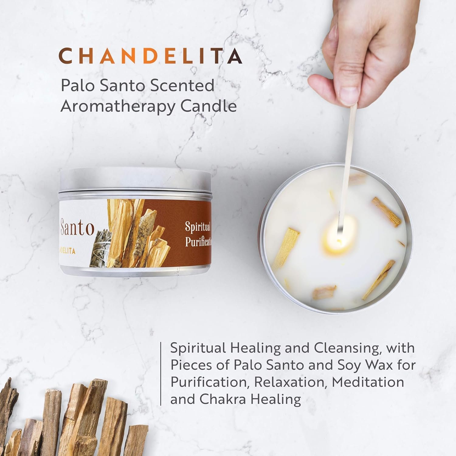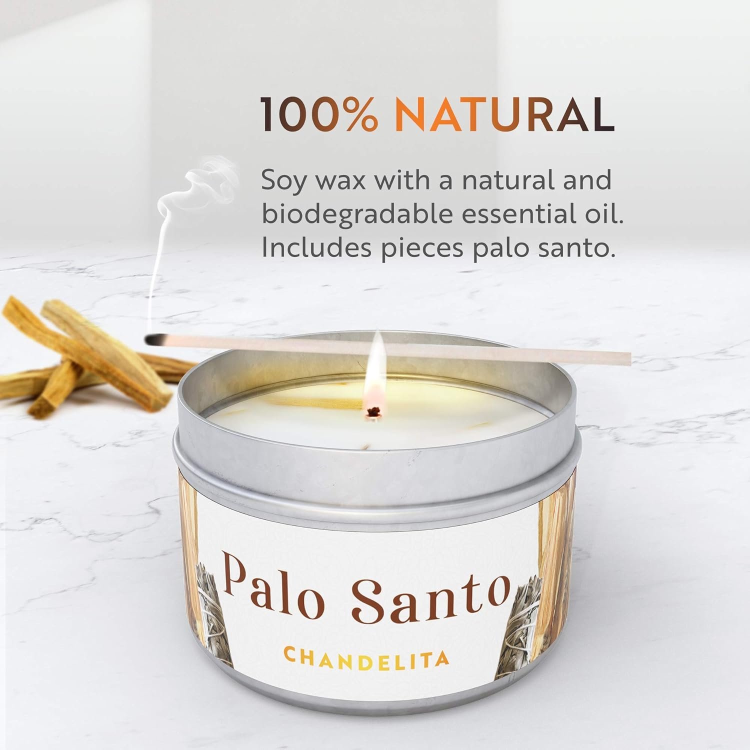 - NATURAL y ECOLÓGICA: cera hecha de soja y aceite esencial natural y biodegradable. Incluye trozos de Palo Santo. 100% ecológico. No incluye aceite de palma ni derivados del petróleo o cera de parafina. La mecha de algodón orgánico sin plomo no producirá humo negro