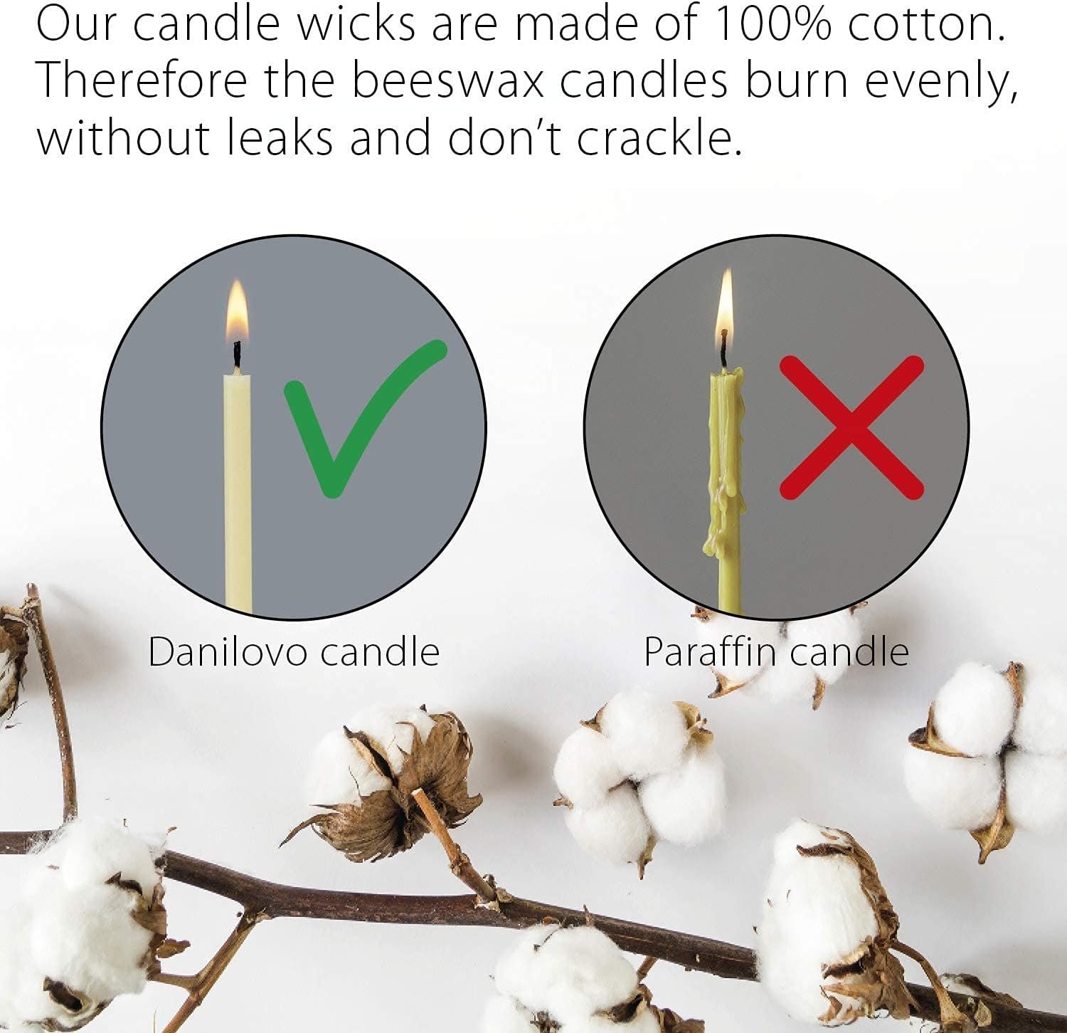 - Estas velas de cera de abeja sin plomo arden de forma más limpia y uniforme que las velas convencionales de parafina o efecto goteo. A diferencia de las ceras de parafina, de palma o de soja, las velas de cera de abeja de Danilovo no dejan restos de hollín ni gotas.
